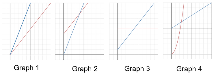 Having completed the graphing exercise with your students, assign them to groups and introduce the accompanying assignment. Each group will choose any of the four graphs and create a narrative based on a real world example that could be represented by the two lines. The graphs vary in difficulty to allow multiple entry points and students are encouraged to present their narrative in any mode they desire. This could include as a story, a video, a dramatic pieces or a poster, among others. Shown below are the graphs students can base their narrative on.